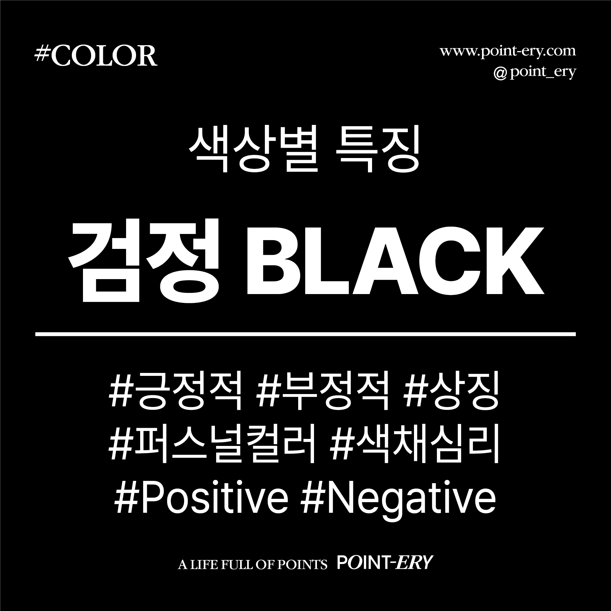 안녕하세요 포인터리입니다.오늘은 디자인과 패션 등 여러 분야에서 사랑받으며,다양하게 사용되는 색, 검정!■저번에는 의미들을 보았는데,이번에는 검정색의 여러가지 특징에 대해서 알아볼까요? ①검정색은 영원과 신비, 절망과 죽음, 어둡고 우울함 등가장 공포감을 주는 색이에요. ②검정색은 밤을 상징하고, 진지하고 겸손한 색이자,삶을 기피하고 무조건 부정을 암시하는 색이기도 해요. ③검정색은 옆에 무슨 색이 오더라도 그 색의 성질을 더욱 도드라지게 만드는 특징이 있어요.따뜻한 색이 오면 색의 온도를 높이고 차가운 색이 오면 낮춰줘요. ④검정색은 신석기시대 동굴벽화에서 최초로 사용했다는 기록이 있어요.14C 유럽에서는 권력과 우아함을 상징하여, 성직자와 귀족들이 검은 옷을 착용하기 시작했어요.19C 사업가들이 검은색 의복을 착용했다는 기록이 있어요.현대에는 모던하고 품위 있으며 남성적인 힘을 드러내고 싶을 때 자주 사용되는 색상이에요.예를 들면 신랑의 예복, 시상식이나 파티 의상,고급진 이미지를 내새우는 브랜드 광고 등에 사용되고 있죠. ⑤검정색은 가장 보수적인 스타일부터 가장 대담하고 전위적인 스타일까지어떤 스타일과도 잘 어울리는 특징이 있어요.기본색으로서 검정은 실루엣을 나타내거나, 서체를 디자인할 때,기능적 요소를 다룰 때 두루 사용되고 있는 컬러랍니다. ⑥검정색은 다른 색을 더욱 선명하게 만들고 돋보이게 하는 성질이 있어요.특히 원색들과 배치하면 대비효과가 있기 때문에 강한 인상을 남길 수 있어요. ⑦시대적으로 검정이 유행하지 않은 적은 한 번도 없었고언제나 신비스럽고 세련된 느낌을 전해주는 색이에요. ⑧검정색은 사회적 상황과 조건에 따라서 많이 사용되는 색상이에요.예를 들면 유행을 타는 것, 불황, 긴축 정책의 심리적 요인, 압박할 때 등주로 검은색 옷을 많이 입어요. ⑨현대 패션에서 검정색은 고급스럽고 강렬한 느낌을 주어,기초색과 악센트 색으로 우아함과 세련됨, 섹시함을 동시에 연상 할 수 있는 역할을 해요.특히 검은색은 비즈니스 모임이나 의례적인 자리에서 흔히 살펴볼 수 있는 색이고,제복에도 많이 쓰이는 색이에요. ⑩종교에서 검은색은 하느님의 적대자로사악하고 어두우며 스스로 빛을 발하지 않음을 의미하기도 해요. ⑪주제별로 검은색은 이러한 것들을 의미해요. ⑴ 유성 - 토성 ⑵ 신체 - 비장 ⑶ 특성 - 인내와 깊이 ⑫한국 전통색채로서 검정색은 흑 黑으로 표현한답니다.흑 黑은 북쪽 北, 물 水, 겨울, 짠맛, 슬픔, 지 智의 의미를 갖고 있어요.이러한 검정색인 흑 黑은 백색과 함께 음의 색으로 쓰였어요.계절로는 겨울을 상징하여 다음(봄)을 준비하는 소생을 상징함과 동시에만물의 흐름과 변화를 의미했어요.흑색 계열의 색채로는 치(검정), 현(밤 하늘색) 등이 있어요.조선시대 궁중에서는 음의 색을 사용하길 꺼렸으나민간에서는 전복 벙거지, 복건, 신부의 도투락 댕기, 제복에 흑색을 주로 사용했다고 해요. 여기까지 검은색의 다양한 특징를 살펴보았습니다.디자인 쪽에서는 절대 빠질 수 없는 컬러 블랙!의미로는 부정적인 방향이 많았지만,특징에서 보면 블랙 컬러는 참 색상 중에서도 매우 중요한 색 같아요. 의미에 관한 글에서도 말씀드렸듯이저도 디자인을 진행할 때 초안은 언제나 블랙 컬러로 사용해서 시안을 진행해요.블랙 컬러로만 되어있는 디자인을 보면 가장 객관적으로 볼 수 있게 해주는 것 같아요.그 다음 여러 컬러를 적용해 보며 더 효과적인 방향을 찾아요. 어떤 컬러를 사용할지 도저히 모르겠다면,검정색을 우선 사용해보는 건 어떨까요? 그렇다면 다음번에는 또 다른 컬러의 특징들도 알아볼게요! 마지막으로 마무리하며 PPL 시간! 포인터리에는 12가지 색의 다양한 의미를 모은포스터를 디자인하여 판매하고 있어요. https://www.point-ery.com/product/Color Color / GRAPHIC POSTER12가지 색상별 상징과 의미를 담은 포스터. 일상에서 만나는 색상에는 여러 가지 의미가 숨어있어요. 색상은 사람이 어떤 물체를 볼 때가장 먼저 인지하는 요소이자가장 오래 기억에 남는 요소라고 해요. 그만큼 중요한 색상은 각각 상징하는 고유한 이미지 있어요.이러한 특징을 이용하여 브랜딩과 마케팅, 심리치료, 명상 등여러 방면에 널리 사용되고 있죠. 이러한 색상의 의미를 생각하며 주변을 살펴보면익숙하던 것도 또 새롭게 다가와요. Life is a painting, and you are the artist. - Paul J. Meyer인생은 그림이고, 당신은 예술가입니다. - 폴 J. 마이어 폴 마이어의 명언처럼좋아하는 색상을 찾아보며일상에 색을 입혀보는 것은 어떨까요? 색과 관련된 정보 참고 자료[참고 서적 Reference Books]- 배색 스타일 핸드북 / 로런 웨이저- 색채심리 / 서양화가 김금안- 컬러 디자인 북 / 도시 속 컬러를 읽다- 컬러컬러컬러 / 김현영, 손경애, 여화선 [참고 블로그 Reference Blogs]- 안나 AND 하나 코치 - 퍼스널컬러 이론- 울산 부자 - 색깔공부- 부산경상대학교 - 디자인계열 [참고 사이트 Reference Sites]- 다다가 관심있는 - 색의 의미- 색채로 마음을 풀어내는 윤혜의 공간 - 색채심리학- 한국의 전통 색체계 (오방정색 / 오방간색 / 잡색)- 한국 