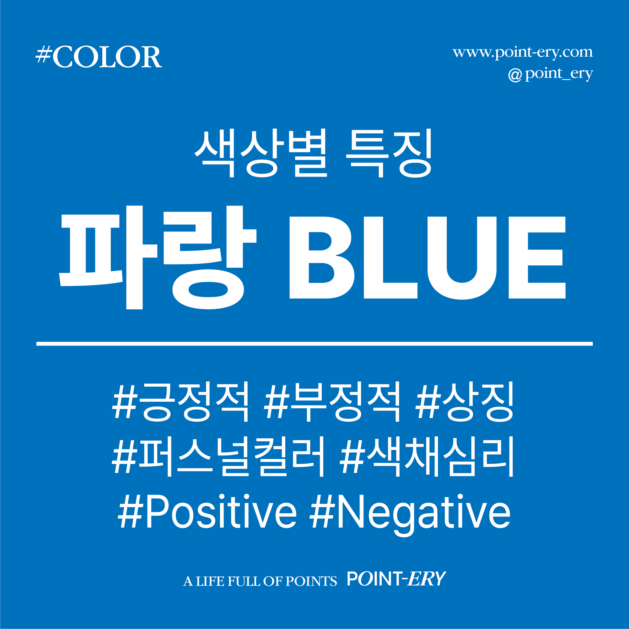 안녕하세요 포인터리입니다.오늘은 신뢰의 상징으로 기업에서도 자주 사용하고,요즘에는 가장 핫한 색이라고 할 수 있는 색, 파랑!■저번에는 의미들을 보았는데,이번에는 파란색의 여러가지 특징에 대해서 알아볼까요? ①파란색은 상쾌하고 차분한 느낌으로 많은 사람들이 좋아하고 널리 사용하는 색이에요. 어느 컬러보다도 다양한 의미를 내포하고 있어요. ② 미국의 색채학자 비렌 Birren의 1988년에 발표한 연구에서는파란색이 뇌파를 이완시킨다는 실험 결과가 있었어요.파란색은 이렇게 맥박, 혈압, 호흡수가 내려가는 안정감을 주는 색이자,광활하며 고요와 이완된 느낌을 주는 색이에요. ③파란색은 또 다른 여러가지 의미가 있어요.높이와 깊이, 자비로움, 헌신적인, 의리 있고 실패함이 없는 것,평화와 안정, 어려움이 풀리는 색, 직관력이 뛰어나고 지혜로워지는 색,깊고 의미 있는 삶의 철학을 상징, 이미 모든 것을 수용하여 편안해진 색,하늘과 바다의 색, 생명력을 일깨우고 열을 받아들이며 신경을 자극 등다양한 의미가 있죠. ④파란색은 시원하고 세련된 느낌을 주는 색상으로 차고 이지적인 분위기를 연출할 수 있어요.또한 명상과 집중의 색으로 불려요.미래 / 신뢰감 / 성장의 의미도 있어 기업의 CI(Corporate Identity) 컬러에 많이 사용되고 있어요.미래의 설계를 뜻할 때 쓰는 청사진이란 말도 이와 연관이 있죠. ⑤고대 이집트인은 파란색을 생명의 색으로 여겼다고 해요. 또한 기독교에서는 희망의 색이라고 표현했어요. ⑥파란색은 종교적 영감을 주는 색이에요.어머니와 같은 자비심의 의미가 있어서 아무런 댓가를 받지 않음을 뜻해요.또한 초자연적인 사랑(엄마가 자식에게 주는 사랑), 모태의 최초 경험(물 속),뜨거운 것을 식혀주고 용해 과정(Solution)을 나타내는 컬러에요. ⑦어두운 톤의 파란색은 보수성을 띄는 색이에요. ⑧파란색은 어느 색상과도 잘 어울리는 특성이 있어요.특히, 흰색과 잘 어울리며 공간을 넓어 보이게 하는 역할을 해요.진보적인 느낌을 주지만 검정을 더하면 보수적인 느낌으로 바뀌는 색이에요. ⑨파란색은 차가움 때문에 소극적이고 지루하며 우울하게 느껴지기도 해요. ⑩주제별로 파란색은 이러한 것들을 의미해요. ⑴ 유성 - 지구, 목성 ⑵ 금속 - 주석 ⑶ 신체 - 간 ⑷ 온도 - 우울증세가 있는 사람 ⑸ 특성 - 정복과 지혜 ⑹ 성 - 여성적 ⑺ 인체구조 - 목 / 의사소통 ⑻ 음계 - 파 ⑼ 무게 - 4.7 lb, 2.131884 kg ⑪한국 전통색채로서 파란색은 청 靑으로 표현해요.청 靑은 동쪽 東, 나무 木, 봄, 간장 肝臟, 신맛, 기쁨, 인 仁의 의미를 갖고 있어요.이렇게 파란색인 청 靑은 우리 민족에게 보편적인 색채로우리는 오랜 기간 청색을 선호하고 애용했다고 해요.청색은 음양오행의 상징성 외에도 우리 고유의 민속적인 상징성을 지니며 사용되기도 해요.파랑은 방위로는 동쪽이므로 해돋이, 밝음, 맑음 등과 연관된 상징성이 있어요.예를 들면 혼례 때 청색과 홍색실을 늘어놓는 것이나 신부복을 청홍색으로 만들어 입히는 것,또한 사주보를 청홍색으로 만드는 데서 그 예를 찾아볼 수 있어요. 또한 청 靑은 초목의 색채로서 성장과 풍성함을 의미해요.이러한 청색은 주로 쪽(여귀과 식물)에서 색을 얻었다고 해요. 여기까지 파란색의 다양한 특징를 살펴보았습니다.자세히 조사하다보니 파란색에는 긍정적인 특징이 정말 많았어요.요즘 트렌드를 선도하는 브랜드들이 파란색을 많이 사용하는데,그 이유를 알 것 갖아요!또한 우리나라에서 전통적으로도 긍정적인 의미로많이 쓰였던 컬러이기 때문에더욱 사랑을 받을 수 밖에 없는 색상 같아요. 이렇게 다양한 색상들의 여러가지 특징을 보니 너무 흥미진진하고,얼른 작업을 할 때 적용해보고 싶어요! 그렇다면 다음번에는 또 다른 컬러의 흥미로운 특징들도 알아볼게요! 마지막으로 마무리하며 PPL 시간! 포인터리에는 12가지 색의 다양한 의미를 모은포스터를 디자인하여 판매하고 있어요. https://www.point-ery.com/product/Color Color / GRAPHIC POSTER12가지 색상별 상징과 의미를 담은 포스터. 일상에서 만나는 색상에는 여러 가지 의미가 숨어있어요. 색상은 사람이 어떤 물체를 볼 때가장 먼저 인지하는 요소이자가장 오래 기억에 남는 요소라고 해요. 그만큼 중요한 색상은 각각 상징하는 고유한 이미지 있어요.이러한 특징을 이용하여 브랜딩과 마케팅, 심리치료, 명상 등여러 방면에 널리 사용되고 있죠. 이러한 색상의 의미를 생각하며 주변을 살펴보면익숙하던 것도 또 새롭게 다가와요. Life is a painting, and you are the artist. - Paul J. Meyer인생은 그림이고, 당신은 예술가입니다. - 폴 J. 마이어 폴 마이어의 명언처럼좋아하는 색상을 찾아보며일상에 색을 입혀보는 것은 어떨까요? 색과 관련된 정보 참고 자료[참고 서적 Reference Books]- 배색 스타일 핸드북 / 로런 웨이저- 색채심리 / 서양화가 김금안- 컬러 디자인 북 / 도시 속 컬러를 읽다- 컬러컬러컬러 / 김현영, 손경애, 여화선 [참고 블로그 Reference Blogs]- 안나 AND 하나 코치 - 퍼스널컬러 이론- 울산 부자 - 색깔공부- 부산경상대학교 - 디자인계열 [참고 사이트 Reference Sites]- 다다가 관심있는 - 색의 의미-