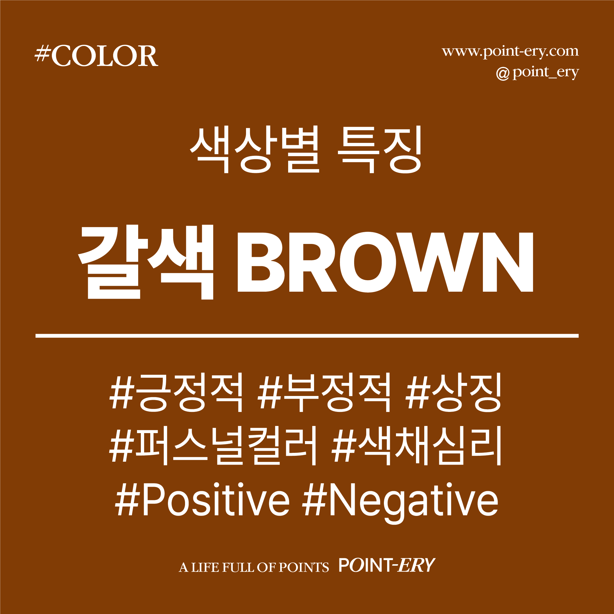 안녕하세요 포인터리입니다.오늘은 땅과 지구, 자연 이미지의 상징이자향수의 분위기도 표현할 수 있는 색, 갈색!■저번에는 의미들을 보았는데,이번에는 갈색의 여러가지 특징에 대해서 알아볼까요? ①갈색은 자연의 색이라고 할 수 있어요.색감의 변화가 풍부하고 초록의 특성을 많이 지녀오히려 초록에 가까운 성질을 갖고 있어요.회색과 마찬가지로 어디에나 잘 어울리고 활용성이 높은 색상이랍니다. ② 갈색은 컬러로서는 인기는 없어도 어디에나 있는 색이에요.또한 게으름과 어리석음의 색이자 편안한 색, 맛이 가장 강한 색,꾸미지 않는 색, 은밀한 사랑의 색, 아름다움의 상징, 회개,금욕생활, 자린고비 같은 습관, 완고한, 신뢰성 등도 의미해요. ③어떤 갈색은 노랑, 초록, 빨강, 회색과 비슷한 색감을 내기도 하며,크림색 Cream의 평온함부터 캐러멜색 Caramal또는 테라코타 색 Teracotta의 따뜻함까지갈색은 매우 다른 느낌을 전달해주는 색이에요. ④갈색은 절망적으로 나타나는 갈등, 충동과 억제 사이에 끼어있는 느낌,묻혀있거나 묶여있는 에너지, 에너지 차단, 소박한 신뢰감을 의미하기도 해요. ⑤ 갈색은 모던함과 고급스러움, 프리미엄을 상징해요.그래서 클래식한 고급스러움을 추구하는 명품 브랜드와 화장품 등의브랜드에서 많이 사용하는 컬러에요. ⑥갈색은 인테리어 분야에서는유행을 타지 않고 편안하고 아늑한 느낌을 추구할 때 주로 사용되고 있어요. ⑦갈색의 컬러를 비즈니스를 할 때나 묵직하고 포용력, 차분함을 강조할 때 입으면 좋아요. 여기까지 갈색의 다양한 특징를 살펴보았습니다.어디에나 잘 어울리고 활용성이 높은 색상인 갈색은눈여겨 주변을 살펴보면 어디서든 쉽게 발견할 수 있는 색상이에요! 요즘 친환경을 강조하는 분야가 많아서이러한 자연을 상징하는 갈색을 다양하게 사용하고 있어요.또한 모던함과 프리미엄의 느낌까지 함께 줄 수 있어서정말 다양한 분야에서 많이 사용하고 있답니다. 그렇다면 다음번에는 또 다른 컬러의 흥미로운 특징들도 알아볼게요! 마지막으로 마무리하며 PPL 시간! 포인터리에는 12가지 색의 다양한 의미를 모은포스터를 디자인하여 판매하고 있어요. https://www.point-ery.com/product/Color Color / GRAPHIC POSTER12가지 색상별 상징과 의미를 담은 포스터. 일상에서 만나는 색상에는 여러 가지 의미가 숨어있어요. 색상은 사람이 어떤 물체를 볼 때가장 먼저 인지하는 요소이자가장 오래 기억에 남는 요소라고 해요. 그만큼 중요한 색상은 각각 상징하는 고유한 이미지 있어요.이러한 특징을 이용하여 브랜딩과 마케팅, 심리치료, 명상 등여러 방면에 널리 사용되고 있죠. 이러한 색상의 의미를 생각하며 주변을 살펴보면익숙하던 것도 또 새롭게 다가와요. Life is a painting, and you are the artist. - Paul J. Meyer인생은 그림이고, 당신은 예술가입니다. - 폴 J. 마이어 폴 마이어의 명언처럼좋아하는 색상을 찾아보며일상에 색을 입혀보는 것은 어떨까요? 색과 관련된 정보 참고 자료[참고 서적 Reference Books]- 배색 스타일 핸드북 / 로런 웨이저- 색채심리 / 서양화가 김금안- 컬러 디자인 북 / 도시 속 컬러를 읽다- 컬러컬러컬러 / 김현영, 손경애, 여화선 [참고 블로그 Reference Blogs]- 안나 AND 하나 코치 - 퍼스널컬러 이론- 울산 부자 - 색깔공부- 부산경상대학교 - 디자인계열 [참고 사이트 Reference Sites]- 다다가 관심있는 - 색의 의미- 색채로 마음을 풀어내는 윤혜의 공간 - 색채심리학- 한국의 전통 색체계 (오방정색 / 오방간색 / 잡색)- 한국 전통 색상 RGB & CMYK
