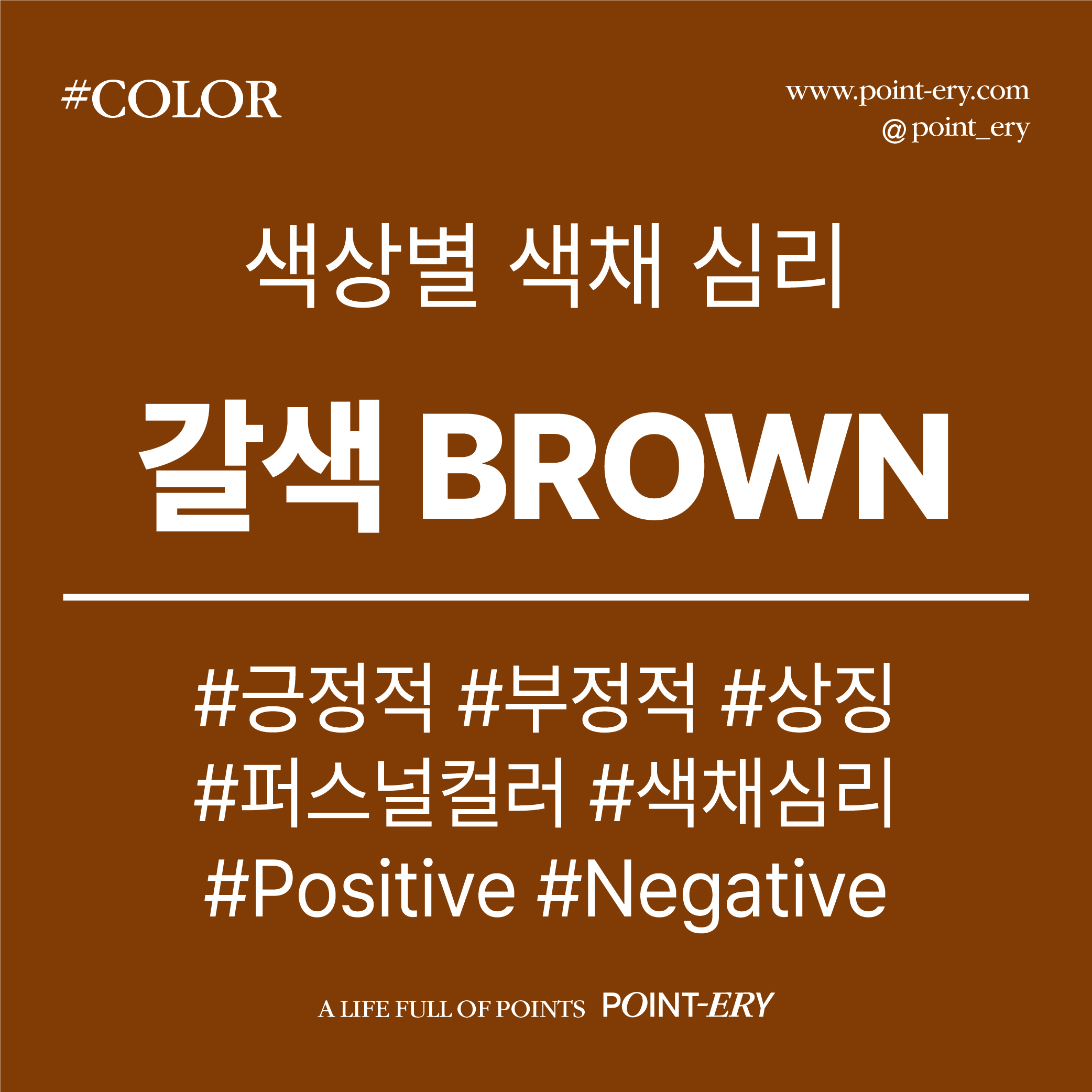 안녕하세요 포인터리입니다.오늘은 땅과 지구, 자연 이미지의 상징이자향수의 분위기도 표현할 수 있는 색, 갈색!■저번에는 의미들과 특징을 보았는데,이번에는 갈색의 여러가지 심리학적 특징에 대해서 알아볼까요? 먼저 색채 심리는 ①심리, ②성격, ③표현3가지 분류로 나누어 보았어요. 그럼 하나씩 살펴볼게요! 심리 갈색이 심리적으로 주는 효과는아래와 같은 특징이 있다고 해요. ①갈색은 흙을 만나기 어려운 현대인의 치료에 필수적인 색이에요. ②갈색은 충동성을 억제하고 책임감을 높여주는 색상이에요. ③점토는 치료의 중요한 매체로 사용되고 있어요.점토를 주무르고 만지며,그들에게 결핍되어 있는 것이 어떠한 것인지를경험하게 됨과 동시에 감정이 이완되는 효과가 있어요. 성격 갈색을 좋아하는 사람이나자신을 표현할 때 갈색으로 표현하는 사람들의 성격은아래와 같은 특징이 있다고 해요. ①충동성을 제어를 잘하며,현실적이고 책임감과 인내력이 강한 편이에요.교만하거나 경솔하지 않으며 겸손해요.우직하고 솔직한 성격이에요.타인에게 필요한 사람이 되고 싶어해요.수줍음이 많고 말수가 적은 편이에요.정이 많고 사람들을 격려해주는 성격이에요.안정적인 것을 추구해요. ②도리에 어긋나는 것을 몹시 싫어해요.친구나 가족에게 아낌없이 헌신하는 편이에요. ③행동과 이해가 다소 느린편이지만 마지막에는 원하는 것을 성취하는 스타일이에요. ④‘내게 맡겨라’라는 말이 입버릇처럼 하는 버릇이 있을 수 있어요.모든 일들을 질서 정연하게 해치우는 능력자에요. 표현 갈색으로 표현을 하는 것에 대한 의미와 효과는아래와 같은 특징이 있다고 해요. ①편안함을 느끼고 보호받고자 하는 무의식의 욕구를 나타내요. ②본인 스스로에 대한 엄격함과 경직, 우울한 심리를 나타내요.어머니와의 갈등을 의미해요.자신을 비난하거나 더럽다고 생각함을 의미해요. ③고동색과 검정색을 함께 사용하는 것은극도의 애정부족, 도벽, 아늑함, 속물과 어리석음을 의미해요. 여기까지 갈색의 다양한 심리학적 특징를 살펴보았습니다.세상을 포용하는 자연의 색상 갈색이생각보다 이중적인 심리학적 의미도 많은 것 같아요.의미가 자연을 상징하기도 하지만고급, 럭셔리의 의미도 있기 때문일까요? 이러한 다양한 특징들을 바탕으로 색을 바라보면주변이 또 다른 시각으로 보이는 것 같아요.그렇다면 다음번에는 또 다른 컬러들의 색채 심리도 알아볼게요! 마지막으로 마무리하며 PPL 시간! 포인터리에는 12가지 색의 다양한 의미를 모은포스터를 디자인하여 판매하고 있어요. https://www.point-ery.com/product/Color Color / GRAPHIC POSTER12가지 색상별 상징과 의미를 담은 포스터. 일상에서 만나는 색상에는 여러 가지 의미가 숨어있어요. 색상은 사람이 어떤 물체를 볼 때가장 먼저 인지하는 요소이자가장 오래 기억에 남는 요소라고 해요. 그만큼 중요한 색상은 각각 상징하는 고유한 이미지 있어요.이러한 특징을 이용하여 브랜딩과 마케팅, 심리치료, 명상 등여러 방면에 널리 사용되고 있죠. 이러한 색상의 의미를 생각하며 주변을 살펴보면익숙하던 것도 또 새롭게 다가와요. Life is a painting, and you are the artist. - Paul J. Meyer인생은 그림이고, 당신은 예술가입니다. - 폴 J. 마이어 폴 마이어의 명언처럼좋아하는 색상을 찾아보며일상에 색을 입혀보는 것은 어떨까요? 색과 관련된 정보 참고 자료[참고 서적 Reference Books]- 배색 스타일 핸드북 / 로런 웨이저- 색채심리 / 서양화가 김금안- 컬러 디자인 북 / 도시 속 컬러를 읽다- 컬러컬러컬러 / 김현영, 손경애, 여화선 [참고 블로그 Reference Blogs]- 안나 AND 하나 코치 - 퍼스널컬러 이론- 울산 부자 - 색깔공부- 부산경상대학교 - 디자인계열 [참고 사이트 Reference Sites]- 다다가 관심있는 - 색의 의미- 색채로 마음을 풀어내는 윤혜의 공간 - 색채심리학- 한국의 전통 색체계 (오방정색 / 오방간색 / 잡색)- 한국 전통 색상 RGB & CMYK