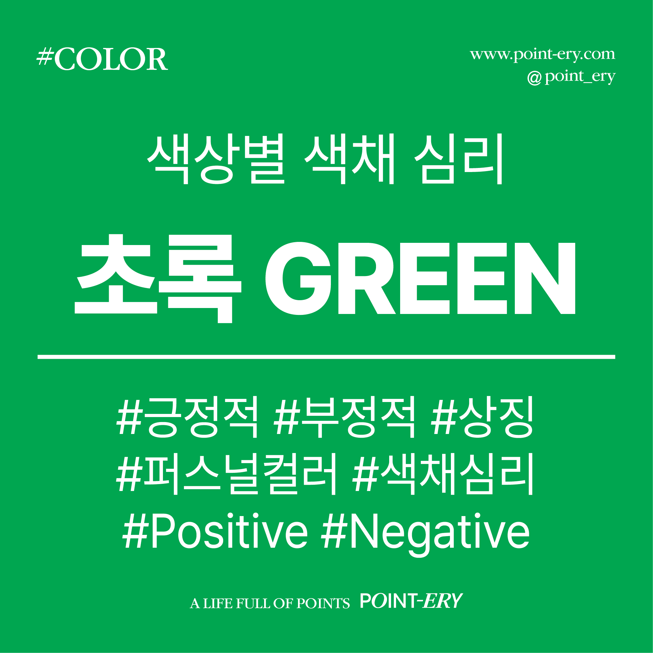 안녕하세요 포인터리입니다.오늘은 자연의 색상을 생각하면떠오르는 색, 초록!■저번에는 의미들과 특징을 보았는데,이번에는 초록색의 여러가지 심리학적 특징에 대해서 알아볼까요? 먼저 색채 심리는 ①심리, ②성격, ③표현3가지 분류로 나누어 보았어요. 그럼 하나씩 살펴볼게요! 심리 초록색이 심리적으로 주는 효과는아래와 같은 특징이 있다고 해요. ①초록색은 심장과 폐의 기능에 도움을 주며, 혈압을 낮추고 감정을 진정시키는 역할을 해요.피로회복, 긴장완화, 에너지 소비를 막아주며 교감신경계에 도움을 준다고 해요. ②명상을 할 때 색상별로 효과가 다르다고 해요.초록색은 명상을 할 때 스트레스를 해소시키고 성장과 판단력에 도움을 주는 컬러에요.자연을 통하여 그린 컬러를 명상하면, 마음을 진정시키고 새 생명과 에너지를 불러일으킨 답니다. ③황녹색은 겁이 많은 사람이나 억압을 받은 사람에게 필요한 색상이라고 해요. ④청록색은 진지함과 신뢰성 및 언행일치가 필요한 사람에게 좋은 색상이라고 해요. 성격 초록색을 좋아하는 사람이나자신을 표현할 때 초록색으로 표현하는 사람들의 성격은아래와 같은 특징이 있다고 해요. ①자신을 분명하게 표현하지 않으면서, 자제하고 겸손하며 사려 깊게 행동하는 특성이 있어요.사회성이 강하고 성실하며, 평화주의자로 온화한 성격이에요. 타인과 다투는 것을 좋아하지 않아요.솔직하고 상냥하며 주변인들을 배려하며 평화롭게 조정하는 중재자 역할을 잘해요. ② 자제력이 많고 충동을 자제하는 능력이 있어요.자기감정을 잘 조절하여 안정되어 있는 성격이에요.어려운 일에 부딪혔을 때 회피하지 않고 견디며, 천천히 목표를 향해 전진하는 노력형이랍니다. ③곧은 심지를 지니고 있으며 균형 잡힌 성격이에요.단단한 이념과 신념으로, 평온함과 강한 본성 2가지 면모를 가지고 있어요. ④잘 웃고 있는 사람이 많으며 도덕성이 있는 사람이에요.상상력이 풍부하며 온순한 편이에요.기품있고 성실하며 가정환경이 좋은 경우가 많아요. ⑤마음의 여유가 많아 다른 사람들의 이야기를 잘 들어주는 편이에요.굉장히 분석적이고 논리적이며 꼼꼼한 성격이에요. ⑥자기주장이 강하고 남에게 인정받기를 원하는 욕구가 강한 사람이에요.엄격함과 명예 등을 추구하는 스타일이에요.타인의 시선을 의식하고, 내향적이며, 예민하고 상처받기 쉬운 성향이에요.수용적인 특징으로 결정장애가 있을 수 있어요. 표현 초록색으로 표현을 하는 것에 대한 의미와 효과는아래와 같은 특징이 있다고 해요. ①초록색은 한색과 난색의 중간색으로, 초록색으로 그릴 경우 자신의 밸런스를 맞추려고 억제하며 애쓰는 마음을 나타내요.능동과 수용을 조절하며, 자기 스스로 치유하고 성장하려는 마음을 보이는 색이에요.쉬고 싶은 마음이 있을 때 필요한 색이라고 할 수 있어요.친절한 마음을 의미하기도 해요. ②초록은 파랑과 노랑이 섞인 색이에요.이는 어머니와 아버지의 색상의 혼합이라 할 수 있어요.양육할 수 있는 능력을 의미하며, 스스로 내면을 돌보는 것과 더불어 남들을 돌보는 것,심리적으로 성숙한 지점에 도달했음을 의미해요.그래서 숲속의 요정이나 선녀의 색상이 초록색으로 주로 사용된답니다.남을 도와주는 직업을 가진 사람의 색이자, 창조와 치유를 의미하는 컬러에요. ③ 짙은 초록색은 밸런스를 맞추기 위해 억지로 참는 상태를 의미해요. ④집안이 완고하거나 엄격한 가정에서 자란 아동을 의미해요.너무 엄한 규율에 대한 반항을 의미하며,허약과 피로, 비애, 몸이 과로했을 때 피로의 상징하는 컬러에요. 질병에 대하여 소생의 의미를 갖고 있답니다. 여기까지 초록색의 다양한 심리학적 특징를 살펴보았습니다.생각보다 초록색을 좋아하는 사람의 특징이뚜렷한 것 같아서 신기해요.주변에도 초록색을 좋아하는 분들이 많은데,비슷한 부분들이 많아 너무 흥미로운 것 같아요!또한 표현하였을 때의 의미는 또 전혀 다른 의미여서 놀라웠어요. 이러한 특징들을 바탕으로 색을 바라보면주변이 또 다른 시각으로 보이는 것 같아요.그렇다면 다음번에는 또 다른 컬러들의 색채 심리도 알아볼게요! 마지막으로 마무리하며 PPL 시간! 포인터리에는 12가지 색의 다양한 의미를 모은포스터를 디자인하여 판매하고 있어요. https://www.point-ery.com/product/Color Color / GRAPHIC POSTER12가지 색상별 상징과 의미를 담은 포스터. 일상에서 만나는 색상에는 여러 가지 의미가 숨어있어요. 색상은 사람이 어떤 물체를 볼 때가장 먼저 인지하는 요소이자가장 오래 기억에 남는 요소라고 해요. 그만큼 중요한 색상은 각각 상징하는 고유한 이미지 있어요.이러한 특징을 이용하여 브랜딩과 마케팅, 심리치료, 명상 등여러 방면에 널리 사용되고 있죠. 이러한 색상의 의미를 생각하며 주변을 살펴보면익숙하던 것도 또 새롭게 다가와요. Life is a painting, and you are the artist. - Paul J. Meyer인생은 그림이고, 당신은 예술가입니다. - 폴 J. 마이어 폴 마이어의 명언처럼좋아하는 색상을 찾아보며일상에 색을 입혀보는 것은 어떨까요? 색과 관련된 정보 참고 자료[참고 서적 Reference Books]-