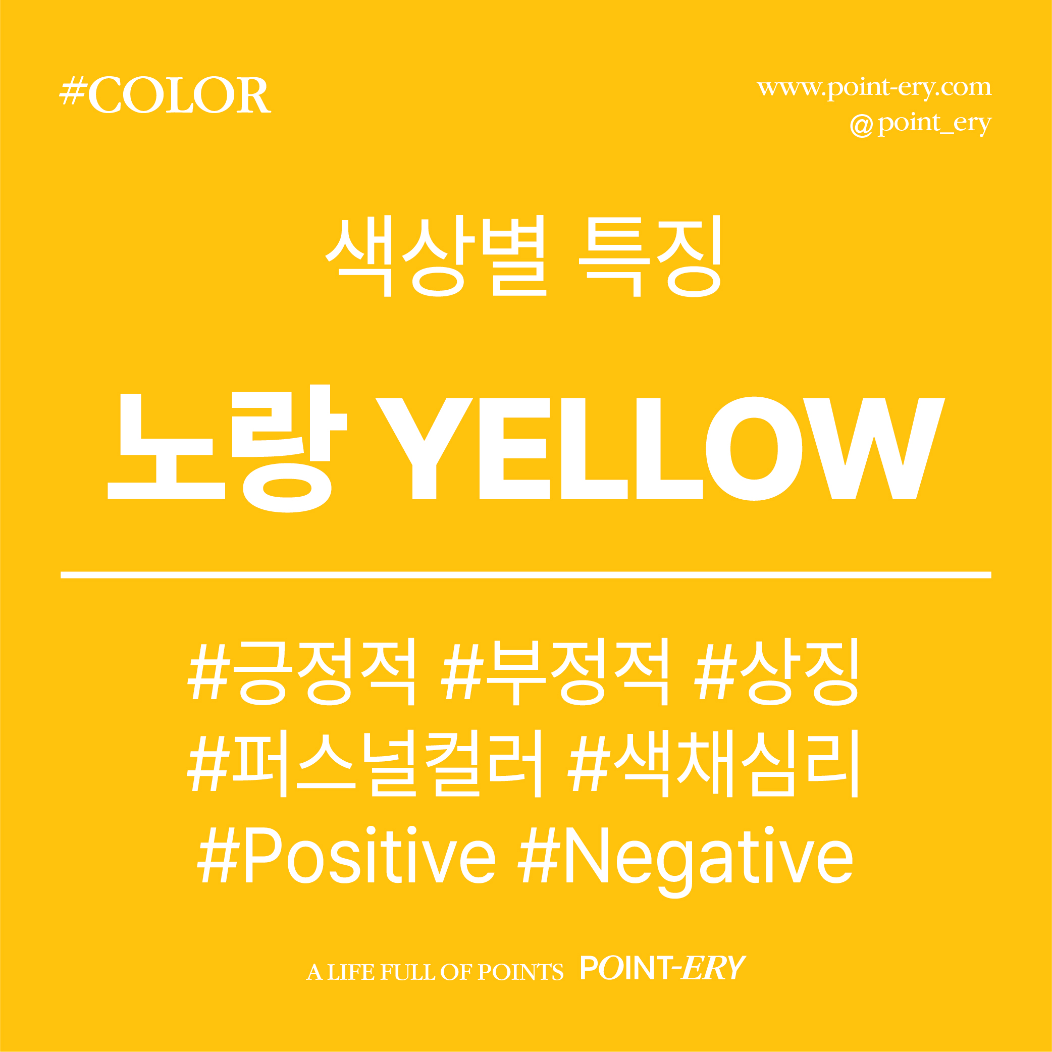 안녕하세요 포인터리입니다.오늘은 발랄함, 따스한 색상을 생각하면떠오르는 색, 노랑!■저번에는 의미들을 보았는데,이번에는 노란색의 여러가지 특징에 대해서 알아볼까요? ①노란색은 흰색 다음으로 밝은 기본색으로원색 중에서는 빛을 가장 많이 반사하는 가장 밝은 색이에요.태양의 색이자 따뜻한 아침 햇살이 연상되며 봄을 느끼게 해요.희망과 모든 것이 잘될 것이라는 느낌을 주고,생동감과 명랑함, 쾌활한 분위기를 주는 색이랍니다.또한 아동적 이미지와 봄을 대표하는 색이자,부드럽고 따뜻하며 가볍고 아름답고 화려한 색이며,에너지가 넘치는 느낌을 주는 컬러에요. ② 파스텔 톤의 노랑은 편안하고 섬세하면서 중성적인 느낌을 줘요.'황금빛'을 띤 노랑은 부를 상징해요. ③노란색은 빨간색이나 주황색과 같이 난색이며 진출색이므로 크게 보이는 경향이 있어요.그래서 경고 메시지나 스쿨버스처럼 확실하게 눈길을 끌어야 할 곳에 사용하면 좋아요. ④ 노란색은 기억력 강화에 영향을 주는 색이에요.형광펜 중 노란색이 많은 이유가 있죠.또한 검정과 같은 어두운 색과 배색할 때 훨씬 명시도가 높아진답니다.그래서 노랑과 검정이 굵게 사선으로 처리된 얼룩무늬는 가장 강한 주의를 끄는 조합이에요. ⑤노란색을 만다라에 많이 쓰면 팽창의 증거인데, 어두운 면을 숨김을 의미하는 것이라고 해요. ⑥노란색은 밝고 산뜻하여 강조하기 위한 색으로 사용하는 게 좋아요.밝은 색조의 파스텔 색과 함께 환하고 캐주얼한 공간을 연출하는 데 적당해요. ⑦노란색의 좋지 않은 이미지로는경박함이나 불신 등의 감정을 의미하는 경우가 많아요.'옐로우 저널리즘 Yellow Journalism(선정주의)’ 등과 같이 경멸의 뜻이 포함되기도 하며,노란 장미의 꽃말은 질투나 이별을 뜻하기도 해요. ⑧노란색은 위에 언급했던 것 외에 또 많은 의미가 있어요.어두운 하늘에 빚나는 샛별, 직관력, 순수함의 극치, 빛의 근원 태양,신성한 품격, 의식성, 새로운 장을 여는 희망적인 몸부림, 새로운 미래,현대적, 보다 발전된 미래지향, 삼라만상 삶을 가져다주는 힘 등의 의미도 갖고 있죠. ⑨노란색은 또한 아버지를 상징하는 색상이며, 남성성과 연관이 있어요.또한 결실을 의미한다고 해요.그리고 여성에게 노란색은 여성이 지니는 무의식적인 남성적 요소인 '아니무스'를 상징한다고 합니다. ⑩칙칙한 노랑색은 또 다른 많은 의미를 갖고 있어요.피부병, 황달, 망상, 정신분열, 광기와 같은 질병, 질투, 혐오, 악의를 나타내며부정적 아버지를 표현하는 컬러라고도 해요. ⑪주제별로 노란색은 이러한 것들을 의미해요. ⑴ 유성 - 태양 ⑵ 금속 - 금 ⑶ 신체 - 심장 ⑷ 온도 - 낙천가 (다혈질적인 사람) ⑸ 특성 - 전지전능하고 생명을 만드는 ⑹ 성 - 남성적 ⑺ 인체구조 - 태양신경층 / 배 / 행동 ⑻ 음계 - 레 ⑼ 무게 - 3.5 lb, 1.587573 kg ⑫한국 전통색채로서 노란색은 황 黃, 금색으로 표현한답니다.황 黃은 중앙 中央, 흙 土, 비장 脾臟, 단맛, 욕심, 신 信의 의미를 갖고 있어요.이렇게 노란색인 황 黃은 모든 색의 근원으로 숭상되었어요.금색은 오행에서는 중앙을 상징하며, 신성한 색이라는 상징성과 함께시각적으로도 사람들의 이목을 집중시킬 때 사용되었어요.황색은 적색 계열의 색채로 분류되어 주로 귀신을 쫓거나 병을 방지하는 데 많이 쓰였는데,예를 들면 신성한 공간인 제의 장소에 금줄을 치거나,해산 후에 사람의 출입을 막기 위해 금줄을 쳤다고 해요.치자, 황련, 황백나무, 울금, 금잔화 등 풍부한 재료에서 황색 계열의 염료를 얻다고 합니다. ⑬노란색은 나라별로 다양한 의미가 있어요.특히나 문화에 따라 의미가 극단적으로 달라지는 색 가운데 하나랍니다.인도에서 노랑은 상업의 색이라는 의미가 있어요.이집트에서는 슬픔과 애도의 색이고,일본에서는 용기를 상징한다고 해요. 여기까지 노란색의 다양한 특징를 살펴보았습니다.자세히 조사하다보니어린아이 같고 발랄한 노란색에부정적인 의미와 특징도 여러가지가 있다는 것이 너무나 놀라웠어요. 또한 노란색은 동양과 서양에서 사용되는 의미의 차이가 큰 색상인 것 같아요.그래도 밝은 의미와 신성함을 상징하는 것은 같다는 것이 너무 흥미로워요. 이러한 특징들을 의도하면서 노란색을 사용하면 좋을 것 같아요.그렇다면 다음번에는 또 다른 컬러의 특징들도 알아볼게요! 마지막으로 마무리하며 PPL 시간! 포인터리에는 12가지 색의 다양한 의미를 모은포스터를 디자인하여 판매하고 있어요. https://www.point-ery.com/product/Color Color / GRAPHIC POSTER12가지 색상별 상징과 의미를 담은 포스터. 일상에서 만나는 색상에는 여러 가지 의미가 숨어있어요. 색상은 사람이 어떤 물체를 볼 때가장 먼저 인지하는 요소이자가장 오래 기억에 남는 요소라고 해요. 그만큼 중요한 색상은 각각 상징하는 고유한 이미지 있어요.이러한 특징을 이용하여 브랜딩과 마케팅, 심리치료, 명상 등여러 방면에 널리 사용되고 있죠. 이러한 색상의 의미를 생각하며 주변을 살펴보면익숙하던 것도 또 새롭게 다가와요. Life is a painting, and you are the artist. - Paul J. Meyer인생은 그림이고, 당신은 예술가입니