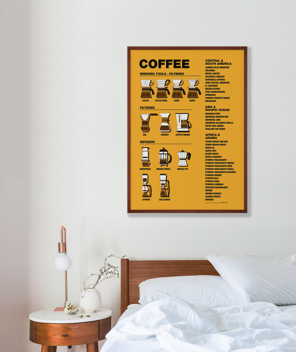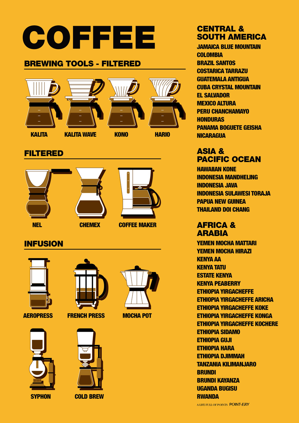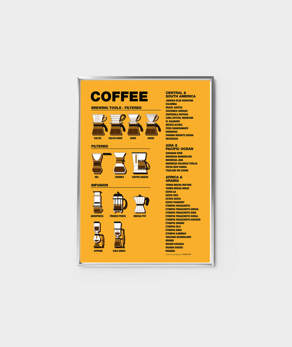 커피를 만드는 12가지 도구와 지역별 커피 원두.