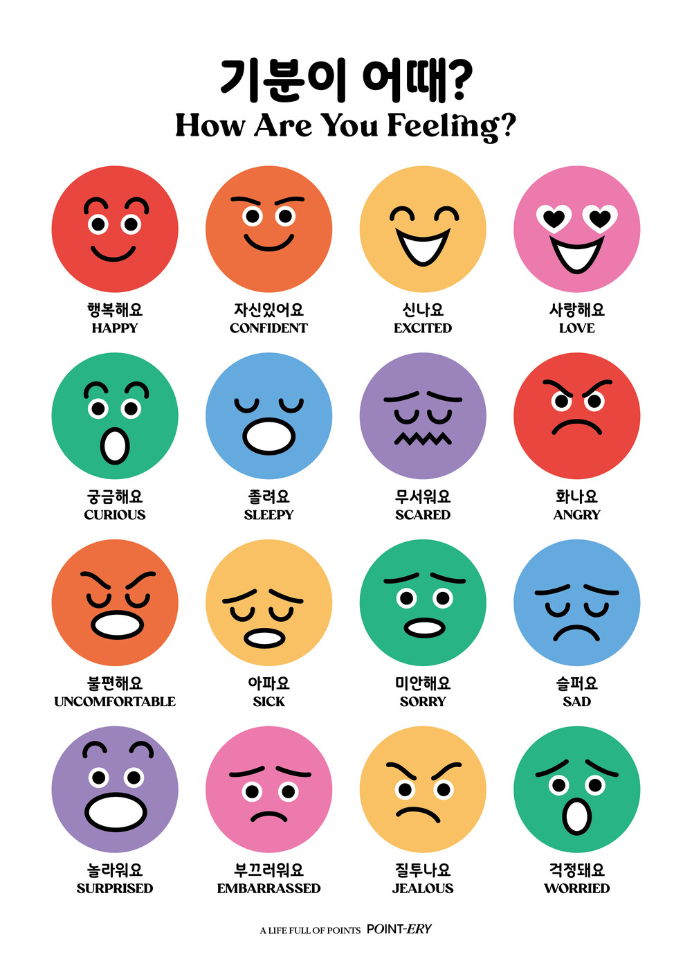 궁금해요 Curious, 졸려요 Sleepy, 무서워요 Scared, 화나요 Angry,