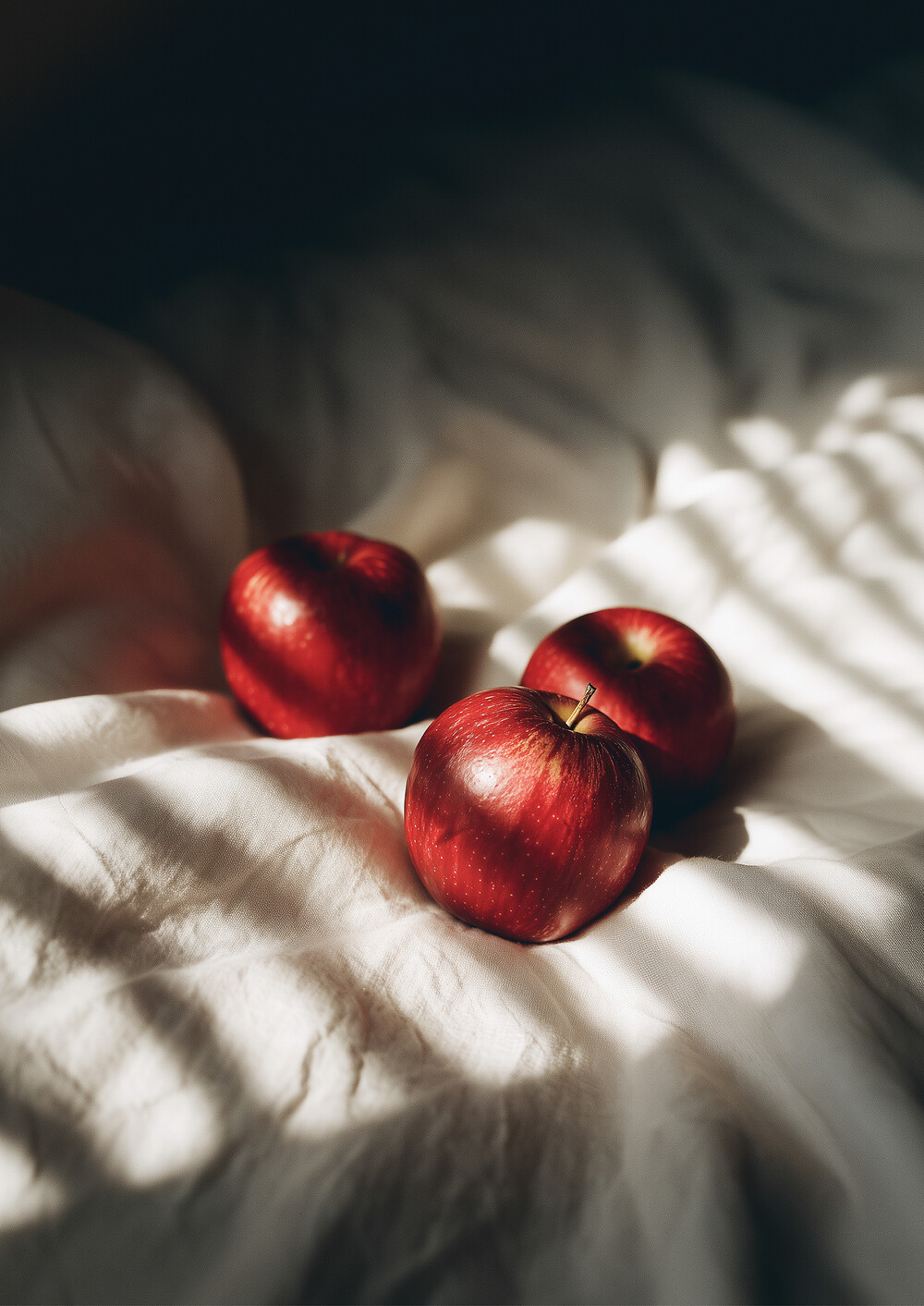 하얀 이불 위에 다정하게 모여 있는 붉은 사과.