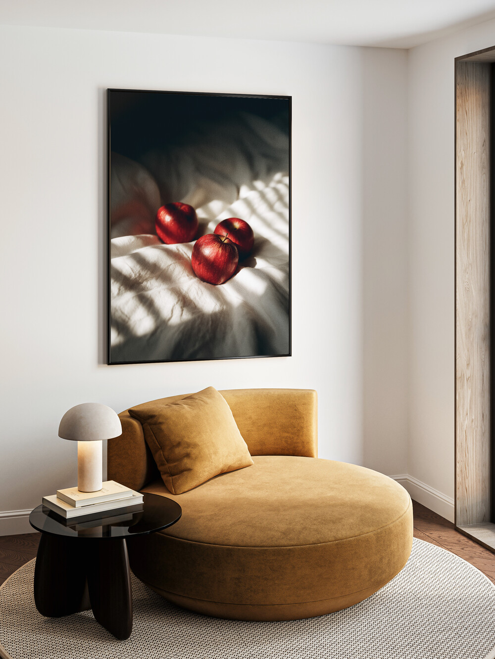 하얀 이불 위에 다정하게 모여 있는 붉은 사과.