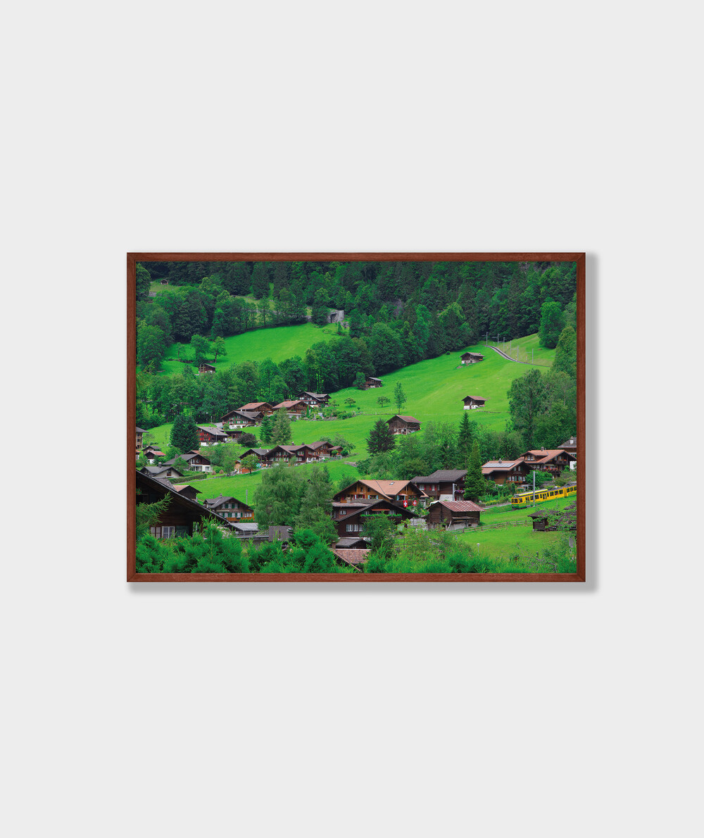 푸른 초원 위에 아름다운 목조 샬레, 배경으로 알프스의 산맥들이 그림을 이루는 그곳.